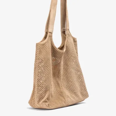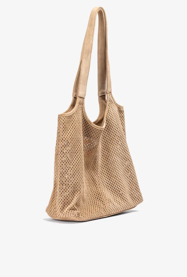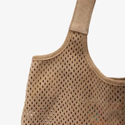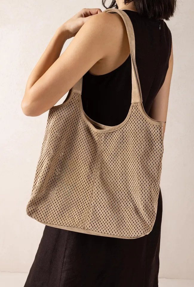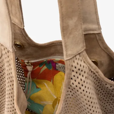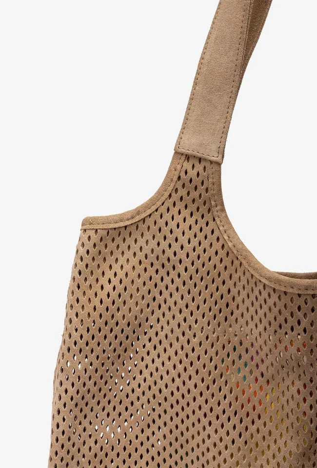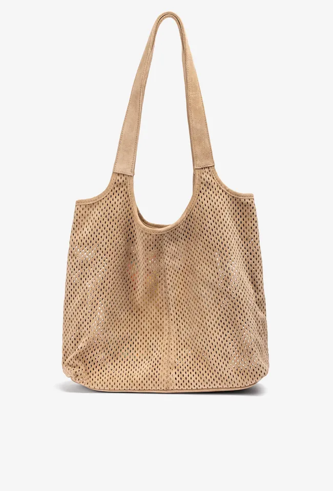 Bolso mediano fabricado en ante con picados. Cierre con imán y bolsillo interior de cremallera. Disponible en varios colores, ¿cuál es tu favorito? Medidas: 28cm x 29cm x 14cm